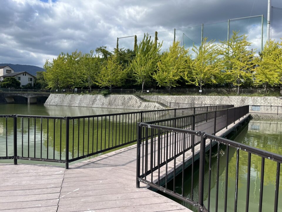 アニメでは桟橋は立ち入り禁止になっていたはずですが、実際は桟橋の先まで行くことができます。池の水はアニメと同じで汚い感じがする….