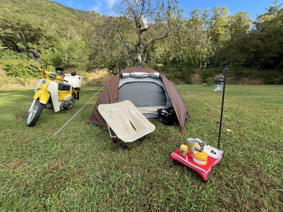 サイトにカブを止めたら早速設営を開始。